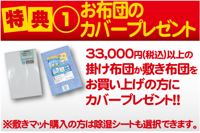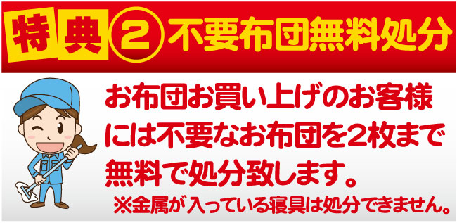 特典①:33,000円以上の掛け布団・敷き布団・マットにカーバーサービス- 特典②:お布団お買い上げのお客様の不要お布団無料処分
