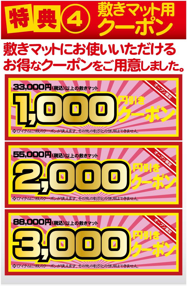 - 特典④:敷きマットにお使いいただけるお得なクーポンをご用意